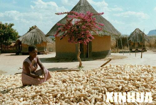 这是一名津巴布韦农妇在自家场院里晒玉米。玉米是津巴布韦的主要农作物。