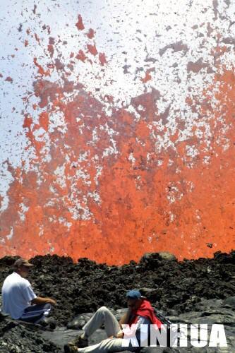 这是2002年1月6日,在印度洋留尼汪岛上的富尔奈斯火山旁,两名游人正在观看火山喷发岩浆。近年来,留尼汪旅游业发展迅速。