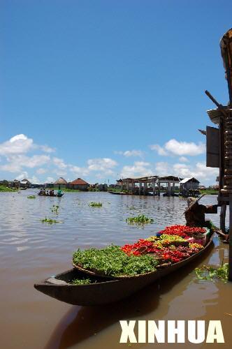 这是2005年10月2日,在贝宁水乡冈维埃,当地小贩用独木舟载着颜色鲜艳的蔬菜穿梭于各家之间。冈维埃位于贝宁共和国科托努市以西约20公里,是贝宁境内最大的水上居住区,现有3万居民,小学、诊所和教堂一应俱全。该地的房屋均建在水中的木桩上,平台近水,木梯入河,自然形成水城,被称作“西非威尼斯”。