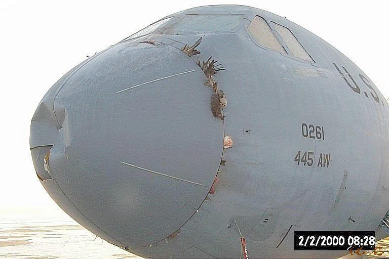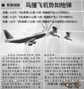 据权威统计,全世界每年大约发生1万次鸟撞飞机事件。自1960年以来,世界范围内由于飞鸟的撞击至少造成了78架民用飞机损失、201人丧生,250架军用飞机损失、120名飞行员丧生。目前,国际航空联合会已把鸟害升级为“A”类航空灾难。