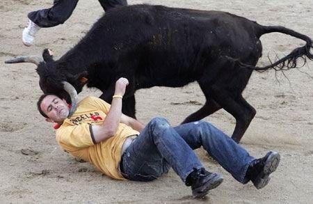 西班牙一年一度的奔牛节的正式名称叫“圣-费尔明节”,圣-费尔明是西班牙东北部富裕的纳瓦拉省省会潘普洛纳市的保护神。奔牛节的起源与西班牙斗牛传统有直接关联。据说当初对潘普洛纳人来说,要将6头高大的公牛从城郊的牛棚赶进城里的斗牛场是件非常困难的事情。17世纪时,某些旁观者突发奇想,斗胆跑到公牛前,将牛激怒,诱使其冲入斗牛场。后来,这种习俗就演变成了奔牛节。1923年,美国著名作家海明威首次来到潘普洛纳观看奔牛并写成了著名小说《太阳照样升起》,他在作品中详细描述了奔牛节,奔牛节因而声名远播。1954年海明威获得诺贝尔文学奖后,西班牙奔牛节更是名声大噪。当地居民为了感谢海明威为奔牛节做出的贡献,特地在斗牛场的大门口,