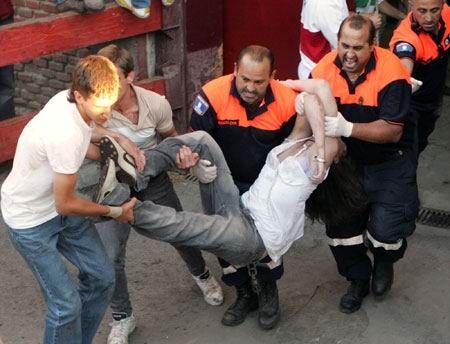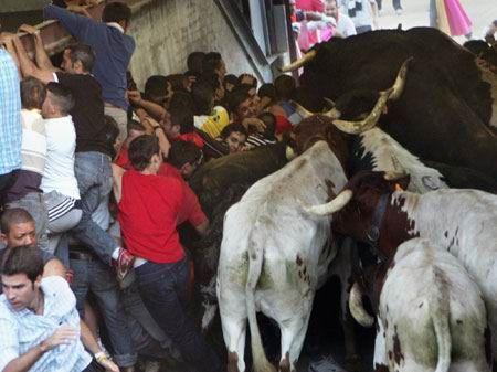 位于潘普洛纳市旧城区的“奔牛之路”其实是一条狭窄的石板街,全长848米。奔牛时,上万名奔牛爱好者挤满了街道,重约500公斤的公牛从牛棚冲出后,在4分钟内以24公里的时速在杂乱的人群中狂奔,时常人仰牛翻,险象丛生,最后以公牛被引进斗牛场为大功告成。奔牛节期间,每年都有人受伤,甚至也发生过死亡事件。据统计,从1924年到2002年,共有14人被牛顶死,200多人被牛顶伤。即使如此,来自世界各地的冒险爱好者每年7月6日至14日这几天还是云集潘普洛纳这个只有18万人的小城,在为期9天的人与牛之间的危险游戏中尽情享受欢乐与刺激。