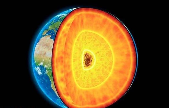 地球的固态铁内核大致和月球一样大,它被液态的外核,一种铁合金所包围。对流驱动外核运动,产生地磁场。