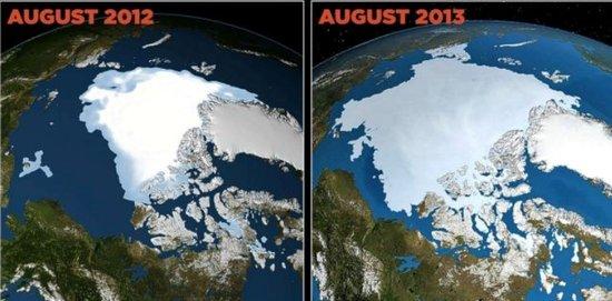 从图中看出2013年北极海冰的面积却出现了增加,科学家认为全球正在进入“冰期”