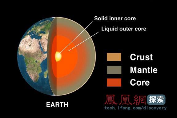 地球有多层:地壳、地幔、液态外核心和固态内核心。