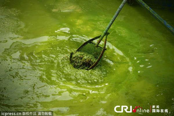这个队伍,一共有13条船,40多号人。队员们每天早上6:30来,下午5点收工回家,中午就在船上吃个简单的盒饭。工作一天,每个村民可以得到100元的收入。周粉娣坐的小船北面,是一段长达四五十米、腻腻厚厚的绿色水面,不远处的桥以北,就是无锡的梅梁湖。武进区另一个蓝藻打捞点在竺山湖一带,负责打捞工作的武进区生态农业服务站站长单军说,今年竺山湖蓝藻发作是历年来最早的一年:4月11日就派人开始打捞了,武进港要迟一些,5月2日才开始。