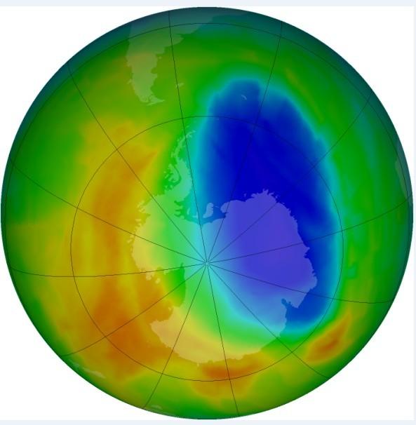 地球大气中的臭氧层构成了地球对抗太阳紫外线的一道天然屏障,这种射线会引发皮肤癌。自从上世纪80年代初期以来,臭氧层空洞便几乎每年都会出现。纽曼表示,南极上空的臭氧层在大约2065年之前都不太可能恢复到上世纪80年代初期的水平。之所以需要如此之长的恢复时间是因为那些造成臭氧消耗的化学物质可以长时间地存在于大气层中。然而整体而言,随着消耗臭氧的化学物质浓度逐渐下降,地球大气层中的臭氧水平总体而言已经达成稳定状态。这种化学物质排放量的下降是国际间共同努力的结果,各国之间达成了协议,共同规范并减少此类有害化学物质的排放。