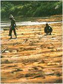 在西非加蓬境内,一段段原木顺河漂流,然后被出售。加蓬的优质热带硬木能卖好价钱。