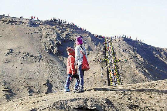 越野车载着我们下山后,云雾逐渐散去,在一片海市蜃楼般的沙漠景观中,马儿驮着我们来到不可思议的婆罗摩火山脚下。登上200级台阶后,张着大口不停冒烟的婆罗摩火山毫无遮拦地暴露在我们眼前。这里的安全工作可以说并不到家,围着火山口的是不到半米高的粗铁丝。两边都是很深的斜坡,一边是火山口,掉下去没人能救,另一边掉下去也会受重伤。偏偏有年轻人站在缠铁丝的石柱上和浓烟合照,让人为他捏一把汗。