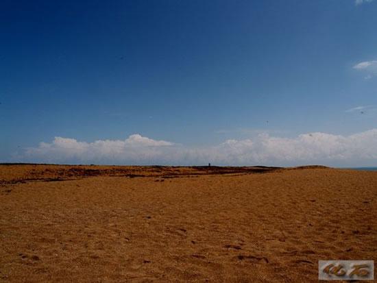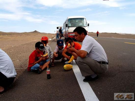 第三天清早,我们从德令哈出发,穿过柴达盆地,去敦煌。一路上都是沙漠,戈壁,植物稀少,只有矮矮的骆驼刺,骆驼很喜欢吃这种草,它的嘴唇很厚,不怕刺。还见到各种个样的山,我帮它们起了有趣的名字,地毯山,排骨山,秃头山,皱纹山。还看到雪山。我们走了一天,才见到一个小村子。路上,三次见到海市蜃楼,在大海中漂浮的岛,河流,树林,房子。我还看到一只鹰在天上飞。