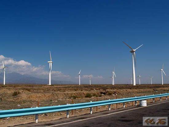 从吐鲁番去乌鲁木齐,汽车走过一条长达四十公里的下坡路,经过达坂城,到了风力发电站,高高的风车站在原野上,像抽风机那样转得飞快。有一个笑话,一位老大爷,来到这里,很惊讶,说:“怪不得吐鲁番那么热,乌鲁木齐那么凉快,原来这么多电风扇吹着乌鲁木齐!”
