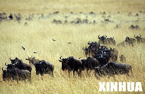 8月7日,在肯尼亚马赛马拉野生动物园内,成千上万只迁徙的角马徐徐前进。