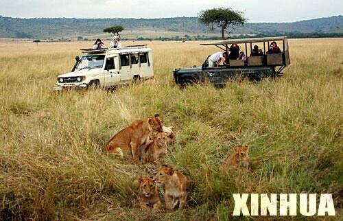 8月6日,在肯尼亚马赛马拉野生动物园内,游客们在观赏一群狮子。