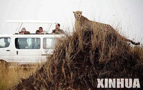 8月6日,在肯尼亚马赛马拉野生动物园内,游客们在观赏一只猎豹。