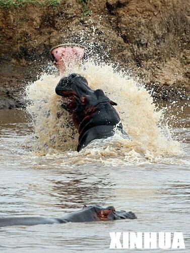 8月6日,在肯尼亚马赛马拉野生动物园内,几头河马在马拉河内嬉闹。