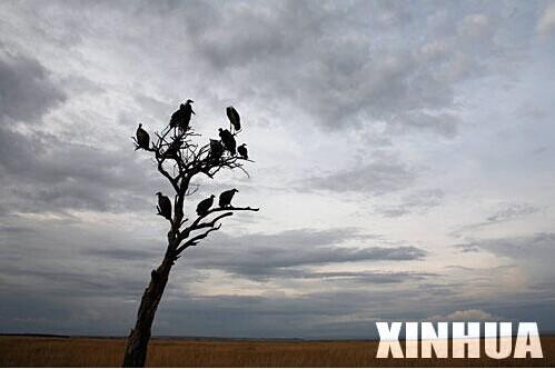 8月5日,在肯尼亚马赛马拉野生动物园内,几只兀鹫在一棵树上栖息。