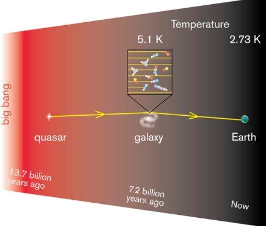 天文学家研究了距离我们72亿光年的一个未命名星系(天体)中的气体物质。使气体保持温暖的唯一能量就是来自宇宙大爆炸所遗留下的宇宙微波背景辐射。一个偶然的机会,科学家们发现了另一个“强大”星系,一个类星体就出现在这个未命名的星系景象背后。该类星体发射的射电波穿过了前景星系的气体,在这个过程之中,气体中的分子吸收了射电波中的部分能量,同时也在射电波的信号中留下了“指纹”证据。