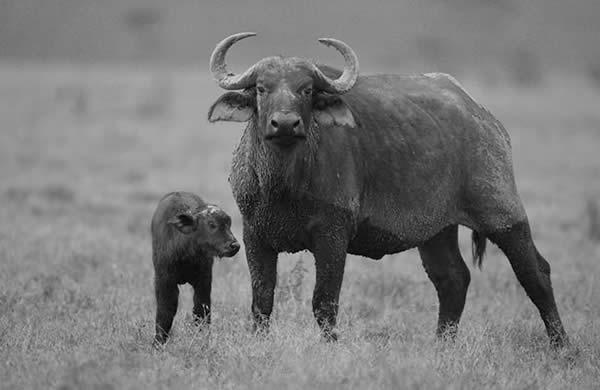 Cape Buffalo and small calf, black and white, Lake Nakuru Kenya