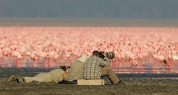 Photographers and Lesser Flamingoes, Lake Nakuru, Kenya