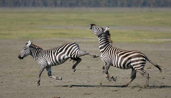 Common Zebra kicking at rival, Lake Nakuru, Kenya