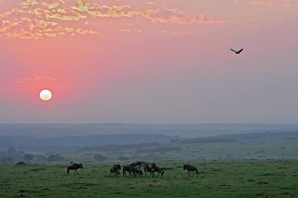 Wildebeests and vulture at dawn, Maasai Mara, Kenya