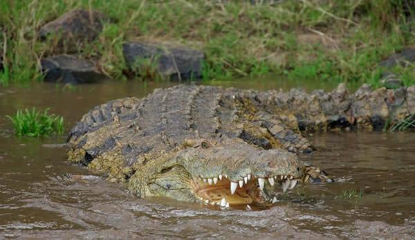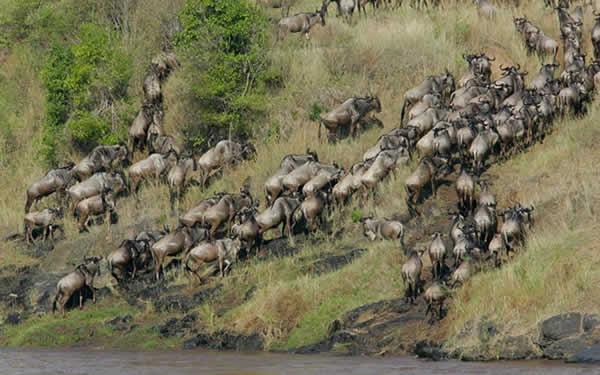 Wildebeest emerging from Mara River after crossing, Maasai Mara, Kenya