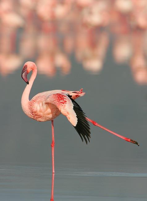 Lesser Flamingo wing stretch, Lake Nakuru, Kenya