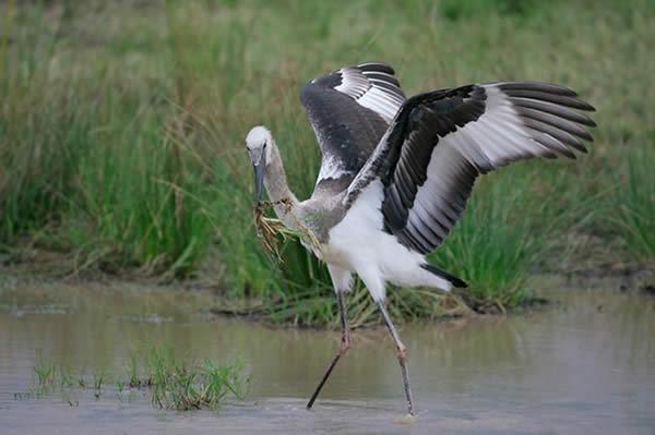 Saddle-billed Stork, immature playing with grass, Maasai Mara, Kenya