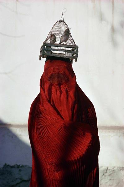 阿富汗,喀布尔,1967年,摄影师:托马斯·亚柏克隆比,这位妇人将市场买来的金翅雀顶在头上,一袭传统的察都里袍围住全身,把她围得与笼中鸟一样的禁闭。
