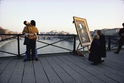 当你漫步在巴黎的街头,在大桥的一角你总会看的这样的一幅景象。在Ponts des Art,靠近Le de la Cite的地方,人们周末聚集在这里,买卖珠宝,艺术品,纪念品,甚至给你提供一个成为蒙娜丽莎的机会。我跟着这个带着无面图片的小伙子,并看着他把摊位支起来。当他的女友来了之后,他们花时间进行了一个长吻——-对那两个小女孩来说,那是一个一点意思也没有的事情。