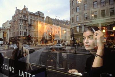 一位年轻女子停下脚步,喝着咖啡,陷入沉思。伦敦吸引着追求时髦和对未来充满憧憬的年轻人。