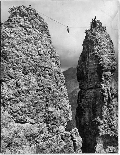 一个行动类似蜘蛛的登山者象提洛尔人那样穿越意大利道罗麦特山脉的两座山峰