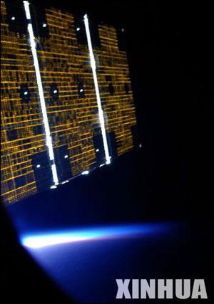 这是费俊龙拍摄的神六飞船的太阳能帆板。在神舟六号上,费俊龙、聂海胜两位航天员共拍摄了300多张照片,其中20幅将在神舟六号载人航天飞行大型纪实摄影展览上展出。新华社发(费俊龙摄)