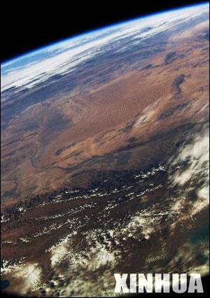 这是费俊龙拍摄的作品,照片中的褐色部分是位于我国塔里木盆地中心的塔克拉玛干沙漠。在神舟六号上,费俊龙、聂海胜两位航天员共拍摄了300多张照片,其中20幅将在神舟六号载人航天飞行大型纪实摄影展览上展出。新华社发(费俊龙摄)