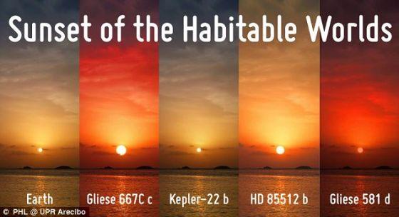 根据可居系外行星目录项目收集的数据,绘制的最新发现的世界中的4个上的日落画面,并把它们与最左侧的地球日落画面作对比。这张图片校正了从一个类地世界看到的恒星和天空的大小、颜色及亮度。开普勒-22b的恒星的大小和颜色与地球的类似,因为它围绕一颗类似太阳的恒星运行。Gliese 667Cc 和 581d上的日落看起来更红一些,因为它们围绕一颗红矮星运行,而Gliese 58的天空看起来更暗淡,因为它距离主星更远。在所有这些画面中, HD 85512b的恒星是最亮的一颗,而Gliese 667Cc的恒星是最大的一个