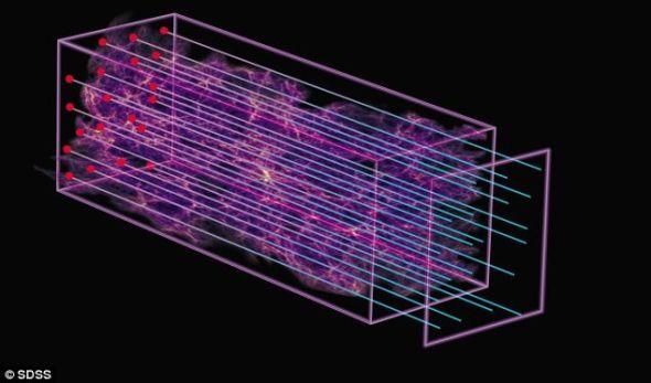 通过探测从每一个类星体(左上的红点)到地球上斯隆基金会2.5米口径望远镜(右下)的氢分布,科学家对遥远宇宙的膨胀速度进行了测算