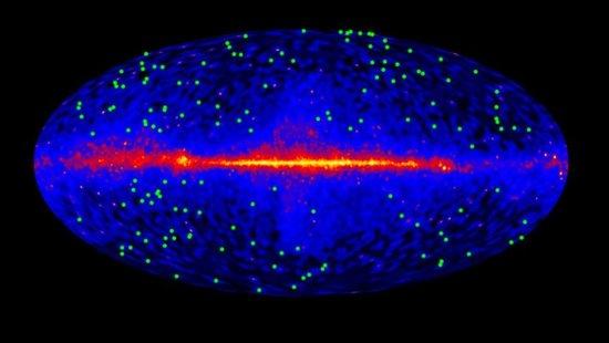 美国宇航局费米探测器巡天数据显示河外星系背景光中存在150个耀变体(绿色点)