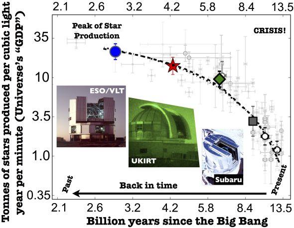 一个天文学家小组研究发现宇宙中恒星生产率的最高峰时期出现在100亿年之前,也就是大爆炸之后仅27亿年左右。自那以后恒星的生产率便一直处于不断的下降之中,而现在的这一数字仅相当于最高峰时期的1/30。该项研究的第一作者是荷兰莱顿大学的大卫·索贝尔(David Sobral),他表示:“你或许可以认为宇宙正处于一种长期的严重危机之中:宇宙的GDP产出目前仅有其高峰时期的3%。”