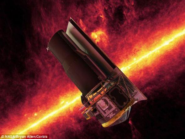 艺术示意图:正在轨道上工作的美国宇航局斯皮策空间望远镜。这台工作在红外波段的望远镜近期给出了迄今最精确的宇宙膨胀测量数据