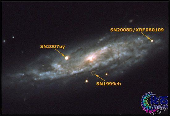 2008年1月9日。用Swift天文台的X-射线天文望远镜对星系NGC 2770进行的例行观测却幸运地获得了意外的发现。这次观测在该星系其中一个螺旋臂中探测到一个意外的瞬时X-射线暴,持续时间为3分40秒。进一步观测表明,这是第一次观测到一种新型Ibc超新星,它被称为SN2008D。以前,这种类型的超新星(由寿命短、但巨大的恒星壮观的爆炸所产生)主要是在实际事件发生之后几个小时以延迟的可见光形式发现的。但这次X-射线暴产生于爆炸之后不久,很可能是超新星激波从前体恒星“分离”出来。它的发现,使SN2008D成为迄今被研究最好的正常超新星。而且,这一发现对于今后的研究工作也有重要意义,因为宽场X-射线卫星观测每年应当能够发现接近爆炸时间的数百个新的超新星。
