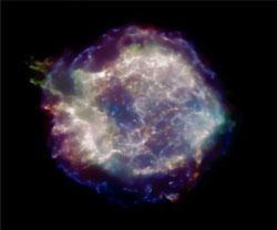 恒星灾难性爆炸迸发出强烈的冲击波,冲击波向外围辐射的速度达到每小时2200万英里(3500万公里)。有些恒星的终结之日会是一次波澜壮观的天文事件,当一颗8倍于太阳质量的称为超新星的恒星烧尽时,地心引力的内部推动力将会将这颗恒星的“内脏”撕裂。这些爆炸推动高能光线和物质喷射入太空。自约翰尼斯·开普勒1604年发现超新星(以其名字命名)以来,天文学家在我们的星系中就没有再看到超新星的踪迹。