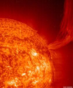 太阳的日冕表面温度可以达到360万华氏度(200万摄氏度),能够以近似光速的速度发射出高能粒子,令人难以琢磨。这些带电粒子称为太阳耀斑,能够促使磁场线向地球方向前进,在那里,它们可以扰乱通讯、卫星技术、电子设备,甚至手机的信号。最大的太阳耀斑能够释放出相当于数百万磅氢弹的能量,如果加以利用,它们产生的能量足够美国用上十万年。天文学家刚刚开始理解太阳的内部工作原理,并提出了预测太阳耀斑的目标。
