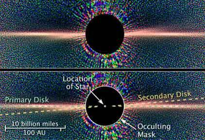 为了拍摄到β-绘架星周围尘埃圆盘的照片,科学家们还专门用到了日冕仪,以便排除恒星强光的干扰。观测发现,两个尘埃圆盘之间的夹角约为4度。而且第二个圆盘距离β-绘架星至少有400亿公里。如果按照先前提出的理论,在第二个圆盘中应当存在着一颗之类相当于木星20倍的巨型行星。这一最新发现还证实,行星可以存在于两个不同平面之中。