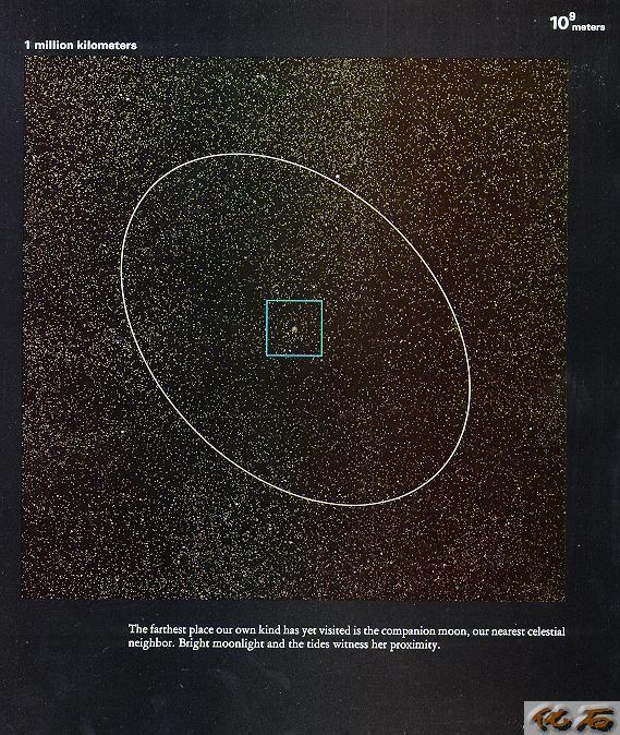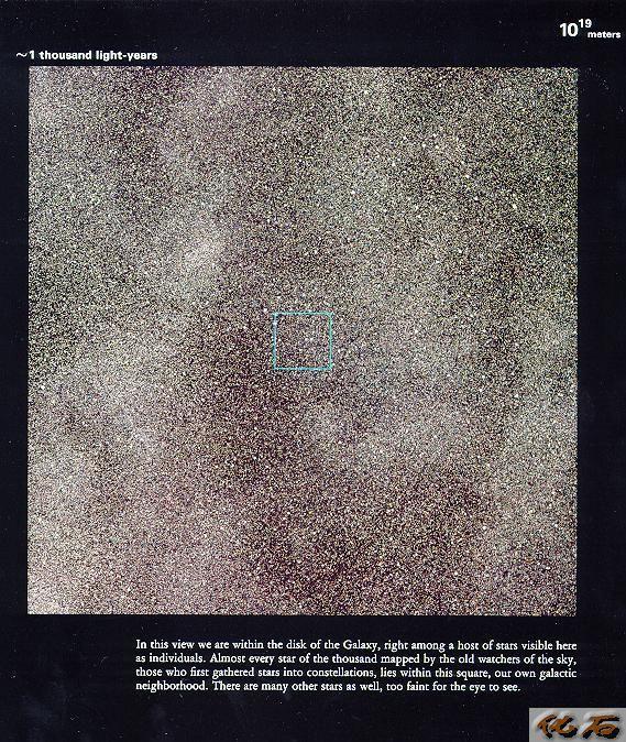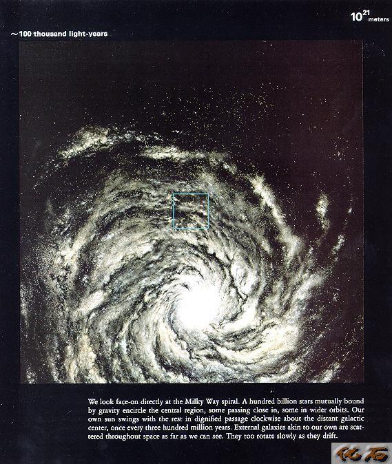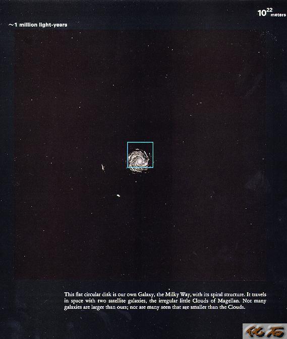 在10万光年这样的数量级下,我们就看见了整个的银河系。事实上,银河系的直径就是十万光年。真有哪位能发明个跟光速一边快的飞船,从银河系的这边飞到对面来个大吊角,就要十万年的时间!我靠,在这样漫长的旅程来看,人生不过朝生暮死,蜉蝣一般。但这只是对相对于银河系静止的观测者而言,船上的人员感受到的旅程其实只有数分钟。相对论呀,深了去了。