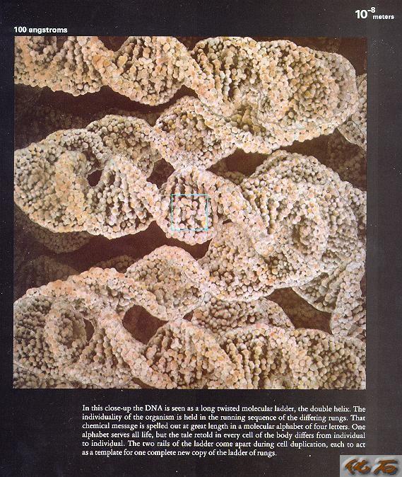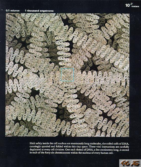 我靠,一看这么高度螺旋的结构就知道是染色体了。底下的洋文说:但凡人类的细胞,里面都会有23对染色体(46条)。