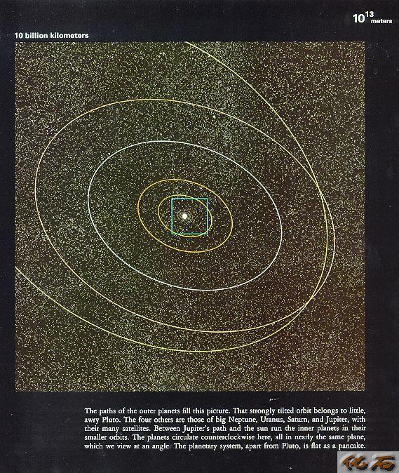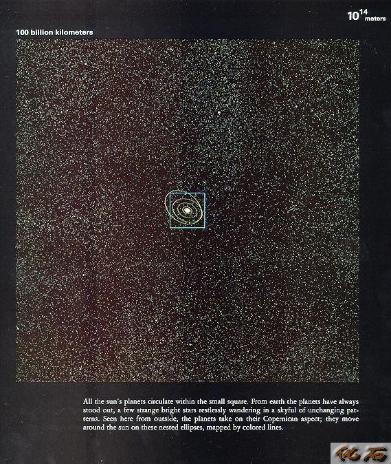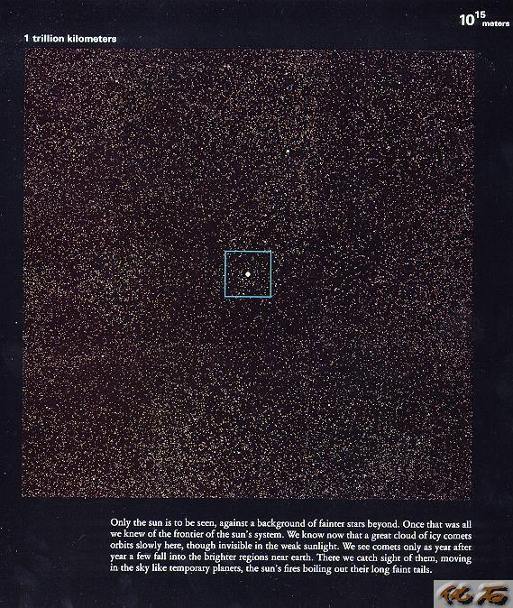 放大十倍来观察以繁星为背景的太阳系。说是繁星,其实与太阳最近的恒星——半人马座比邻星都是在4.22光年开外的。图中的亮点仅仅只是背景上离得八丈远的星星呢,并不是太阳系的一部分。