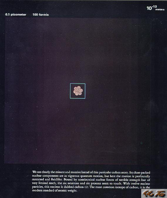 走近点,这就是传说中的原子核了。10的-12次方米叫做一皮米。在0.1皮米的数量级下看原子核就可以看出很多个球球来,它们是带正电的质子和不带电的中子。