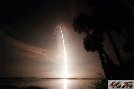 航天飞机在离开发射中心向太空攀升的过程中,由于地球曲率,形成一条美丽的抛物线。
