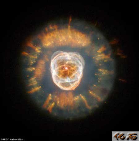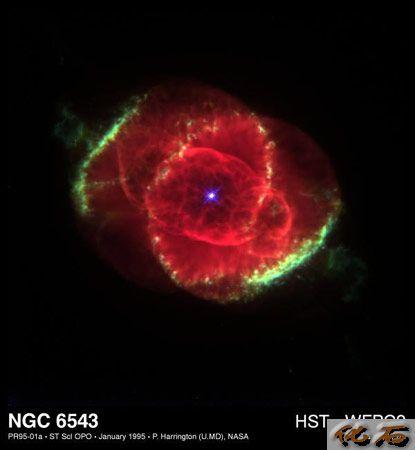 这是对正在走向死亡的恒星的动态特性和最新演化的直观记录,猫眼星云距离我们3000光年,是一颗正在走向死亡的恒星向外抛射出的气体壳层造成的。这一哈勃望远镜拍摄到的图像揭示出猫眼星云是最复杂的“行星状星云”之一,也正是由于它的结构十分复杂,以致科学家们甚至怀疑星云中心的恒星可能是一双星。行星状星云是天文学家专用以描述这一类死亡恒星向外抛射气