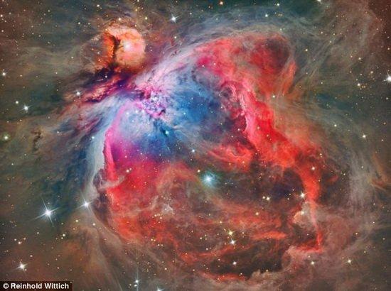 这张美丽的太空图像令人印象深刻,但维蒂希承认使用了图像软件进行了加工。猎户星云也被称为M42星云,是位于猎户星座腹带的一个弥漫星云。它距离地球1500光年,可能直径为24光年。